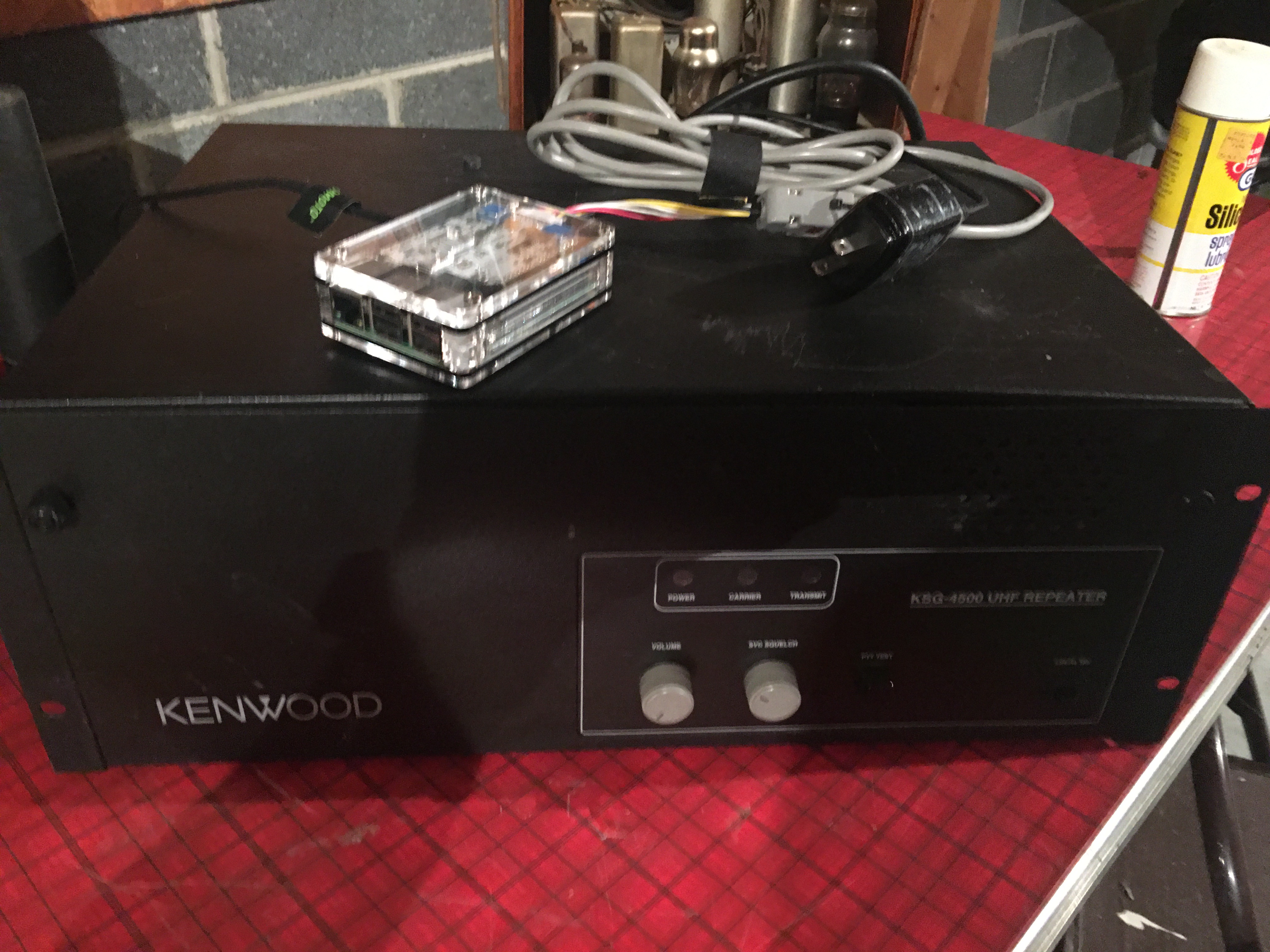 You can see the pi sitting on top, with external power supply for the pi, as well as really long interface cable for interfacing to the repeater. A really sweet setup, but maybe I can squeeze it all inside the repeater chassis? Challenge accepted!