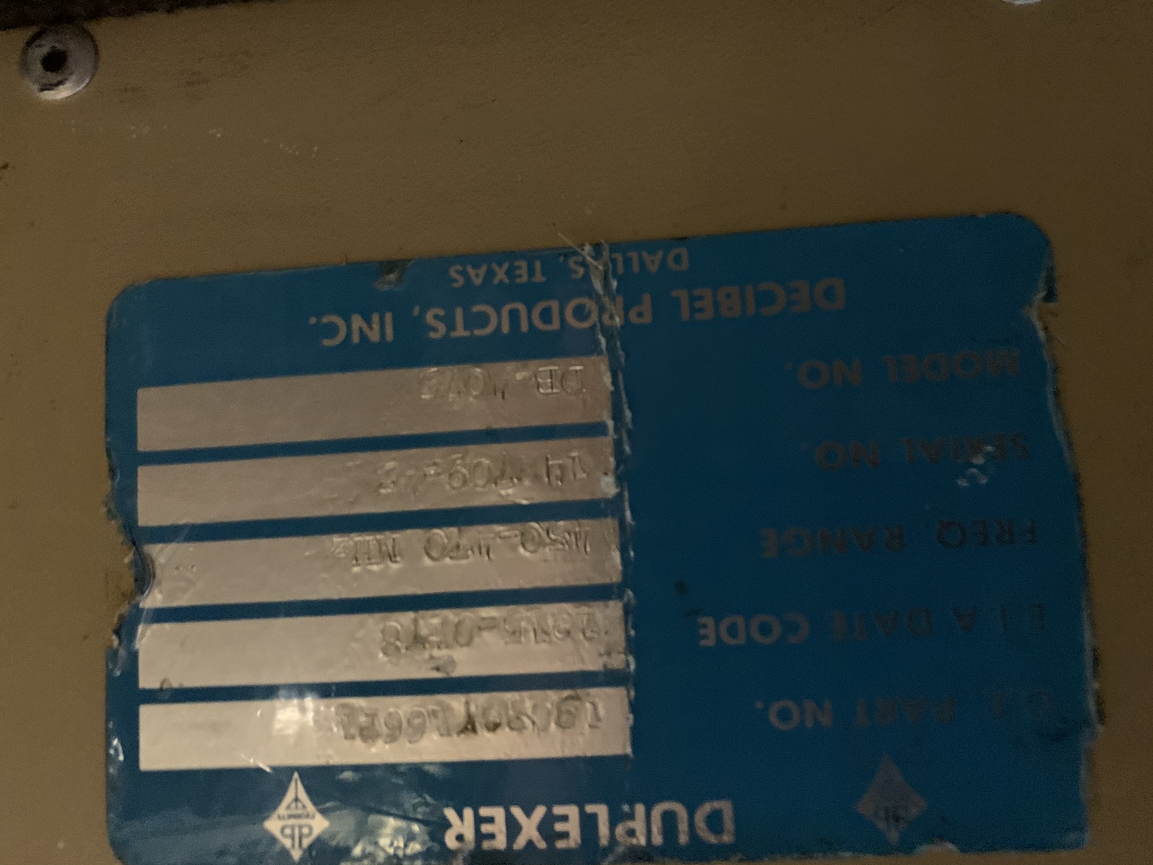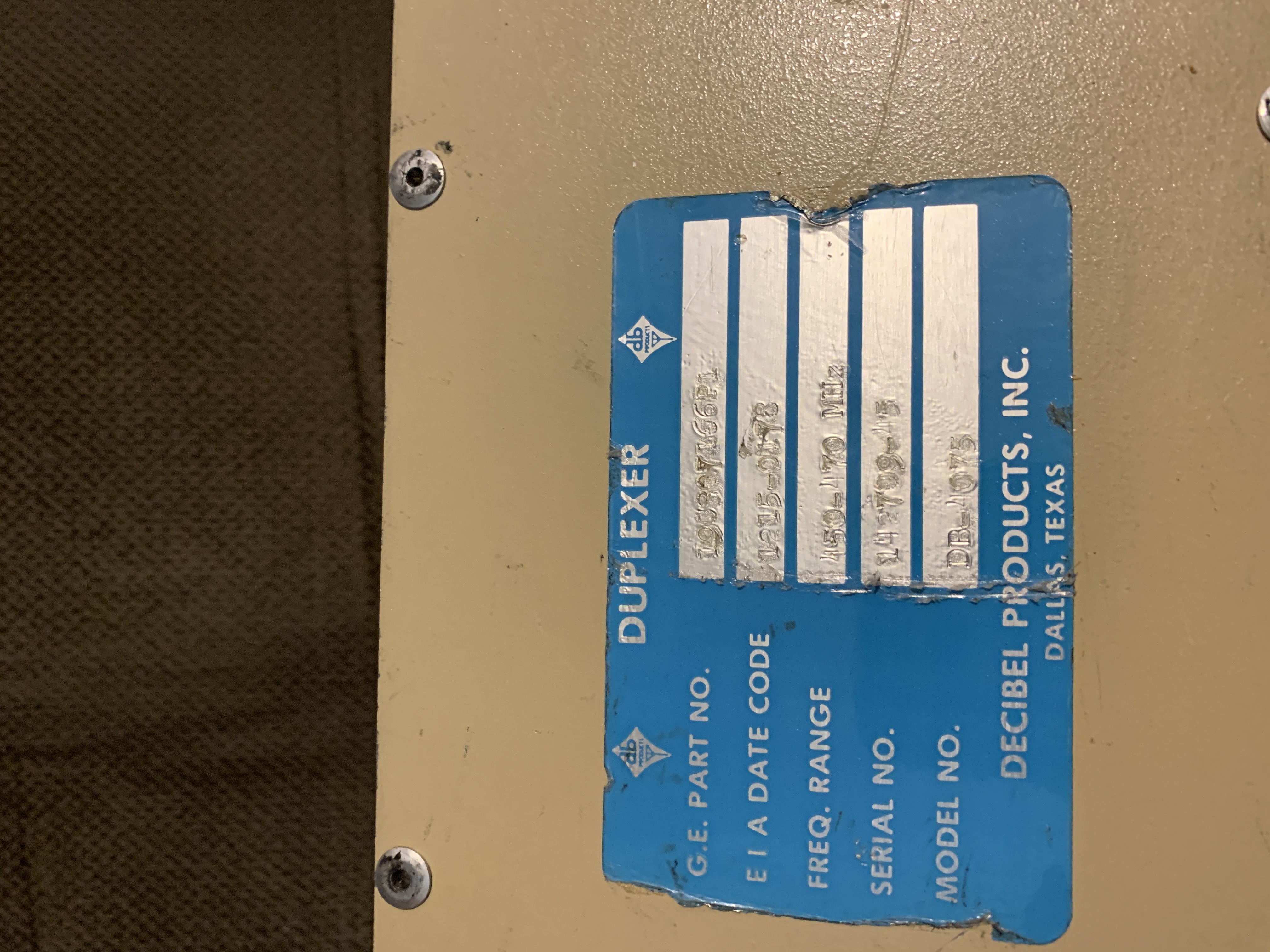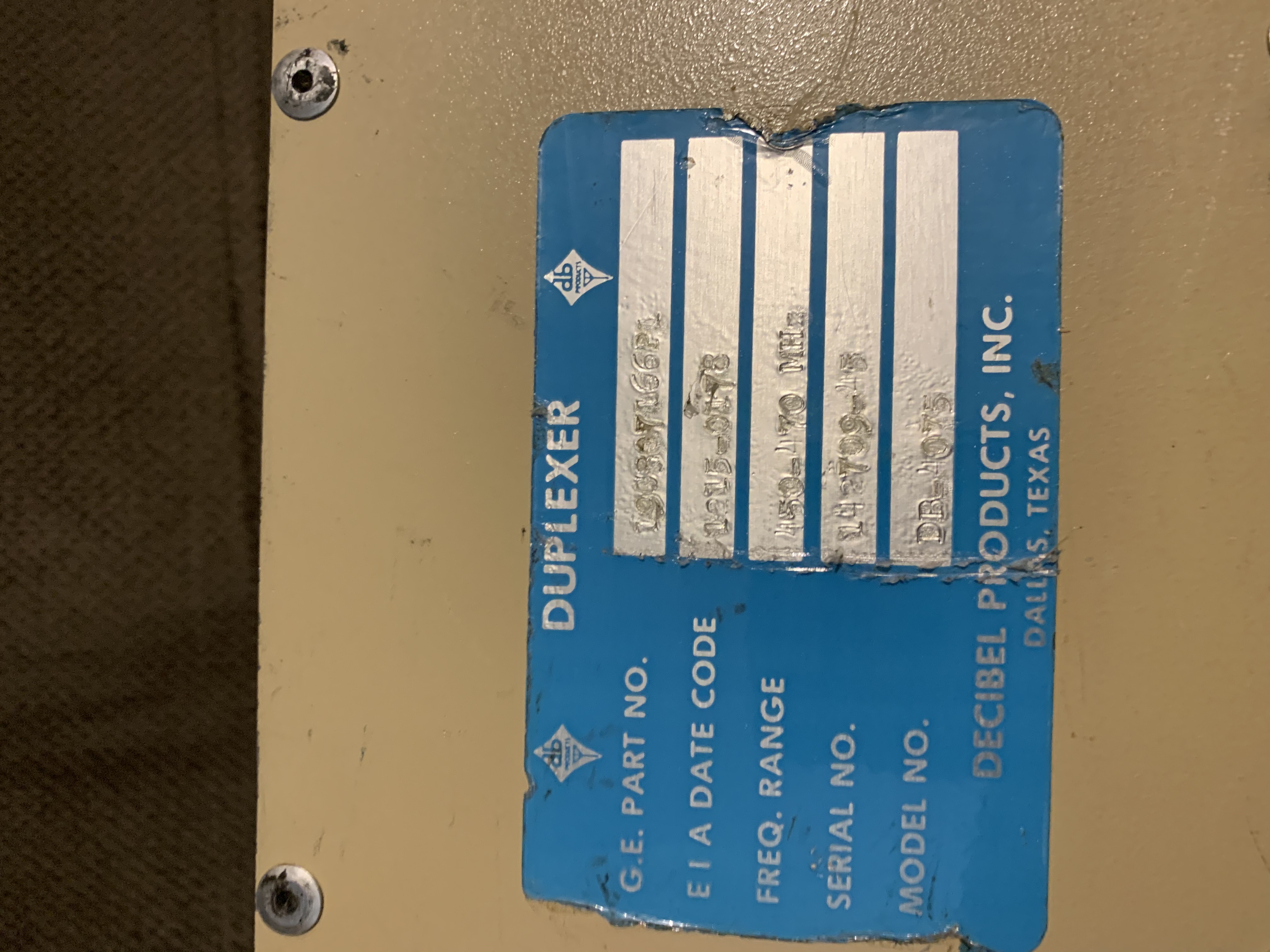 It looks like a Decibel Products DB-4075, originally for the 450-470 MHz band, date code looks like "1215-0178", and serial# looks like 190807166P1. It seems to be working quite well for my repeater. (440.675 and 445.575)